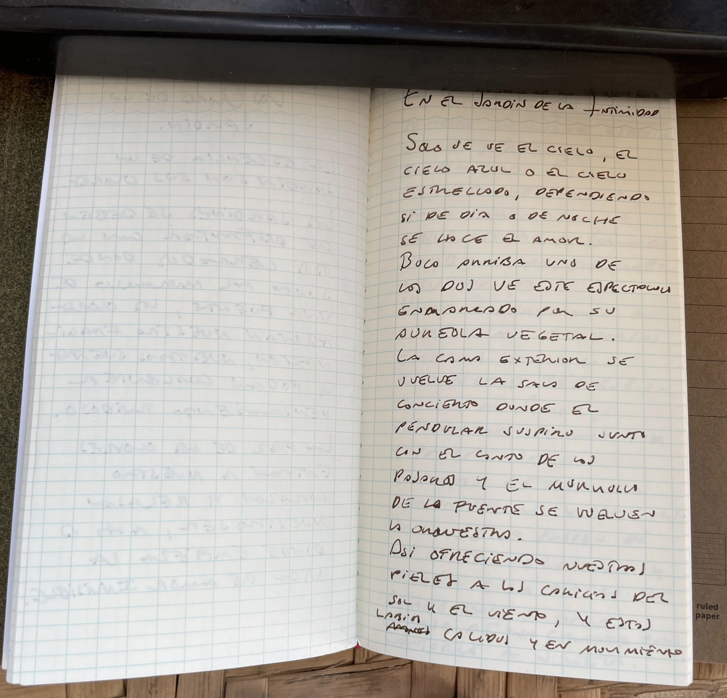 Cielo enmarcado por su aureola vegetal. Este jardín se vuelve la sala de concierto, donde el suspiro pendular, junto con el canto de los pájaros y el murmullo de la fuente se sueñan orquesta. Ofreciendo nuestras pieles y almas a las caricias del sol, las estrellas y el viento, estos labios cálidos y juguetones agradecen en suave movimiento…